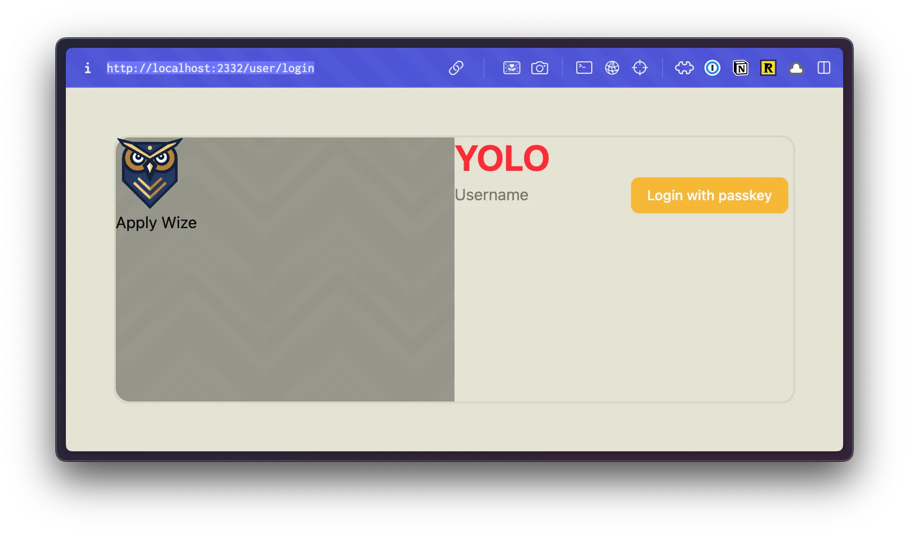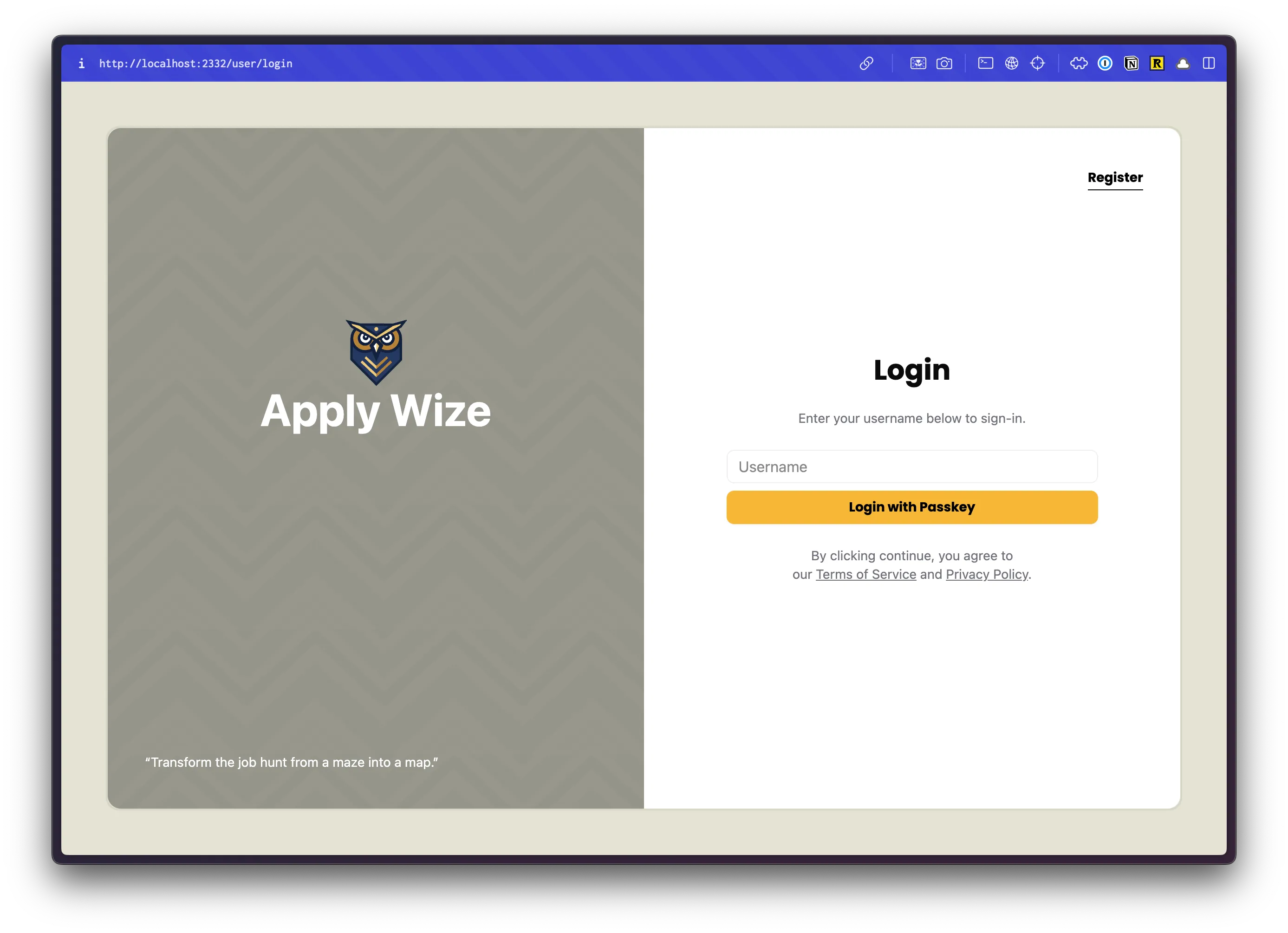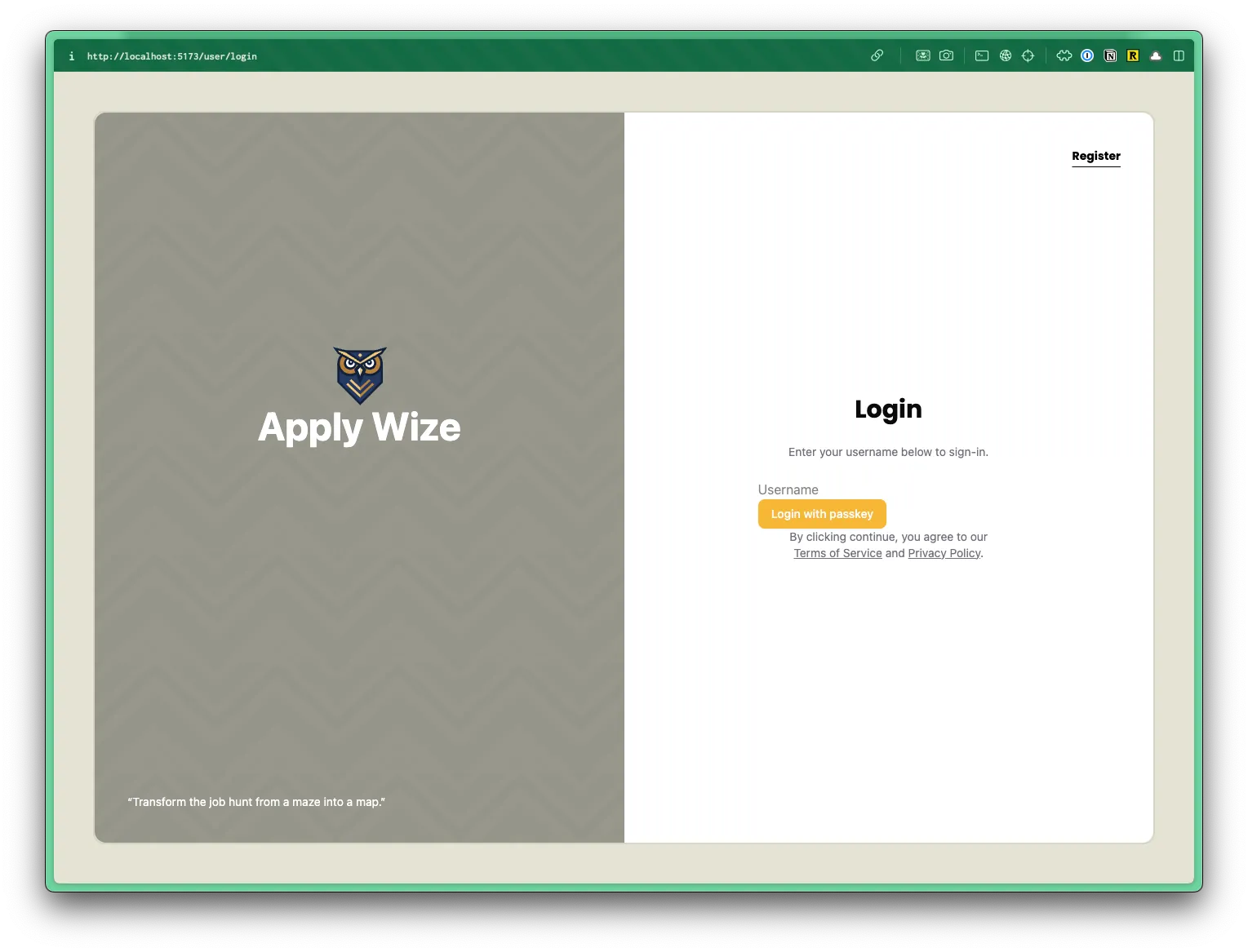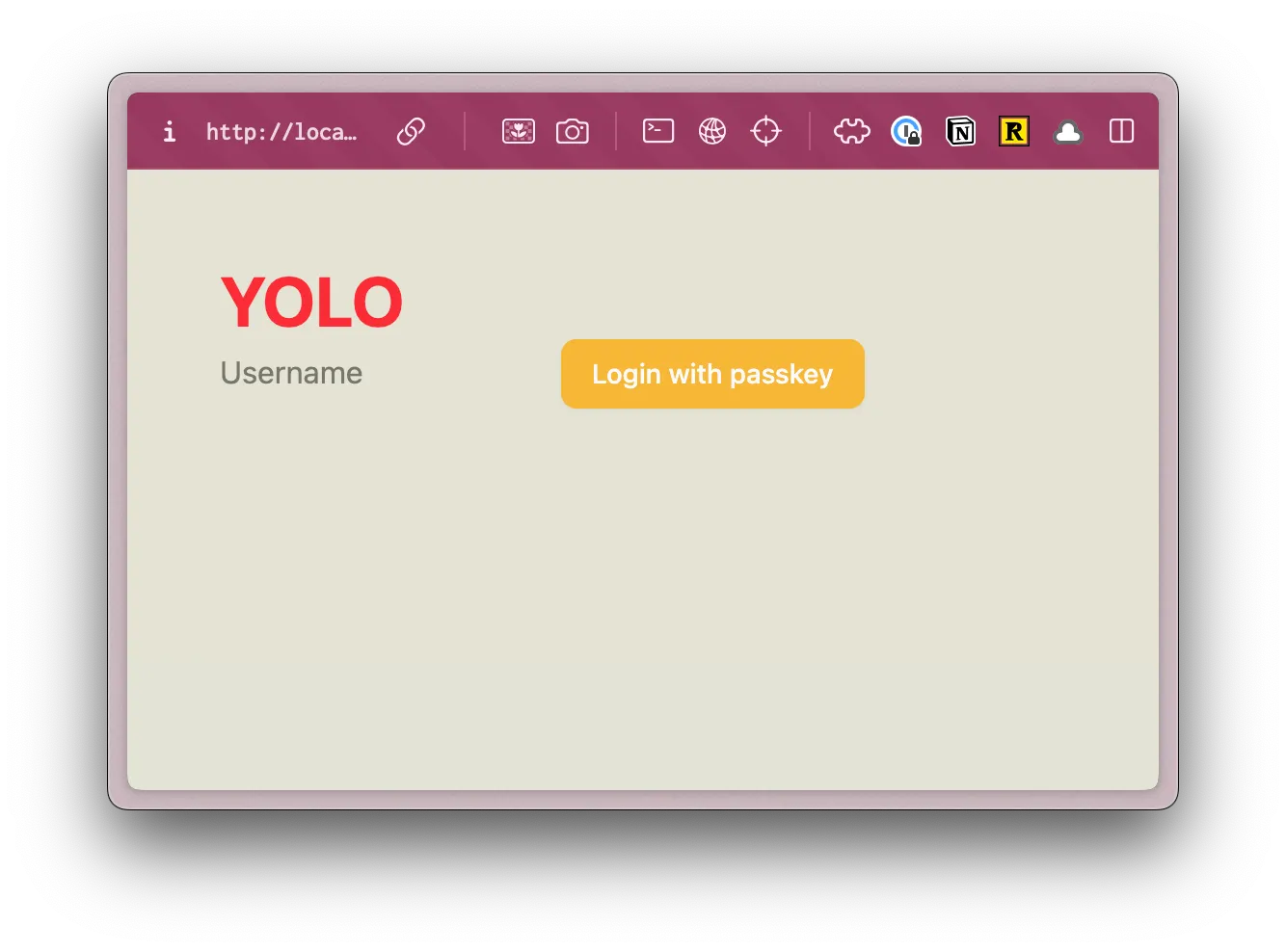 <div className="absolute top-0 right-0 p-10"> <a href={link("/user/login")} className="font-display font-bold text-black text-sm underline underline-offset-8 hover:decoration-primary" > Login </a> </div> <input type="text" value={username} onChange={(e) => setUsername(e.target.value)} placeholder="Username" /> <Button onClick={handlePerformPasskeyRegister} disabled={isPending}> {isPending ? <>...</> : "Register with passkey"} </Button> {result && <div>{result}</div>} </div> </main> );- We're using the same styles as our login page.