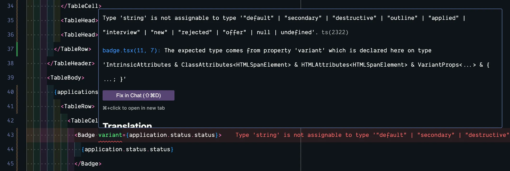 <TableCell> <Badge variant={application.status.status}> {application.status.status} </Badge></TableCell>When we pass in the variant prop for our Badge component, it’s not just looking for a string, it’s looking for a specific string: "default" | "secondary" | "destructive" | "outline" | "applied" | "interview" | "new" | "rejected" | "offer" | null | undefined