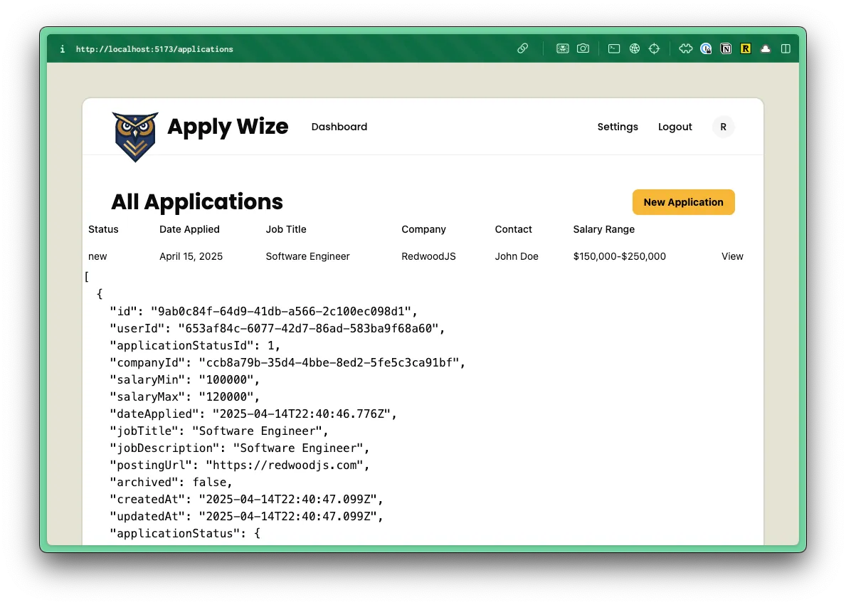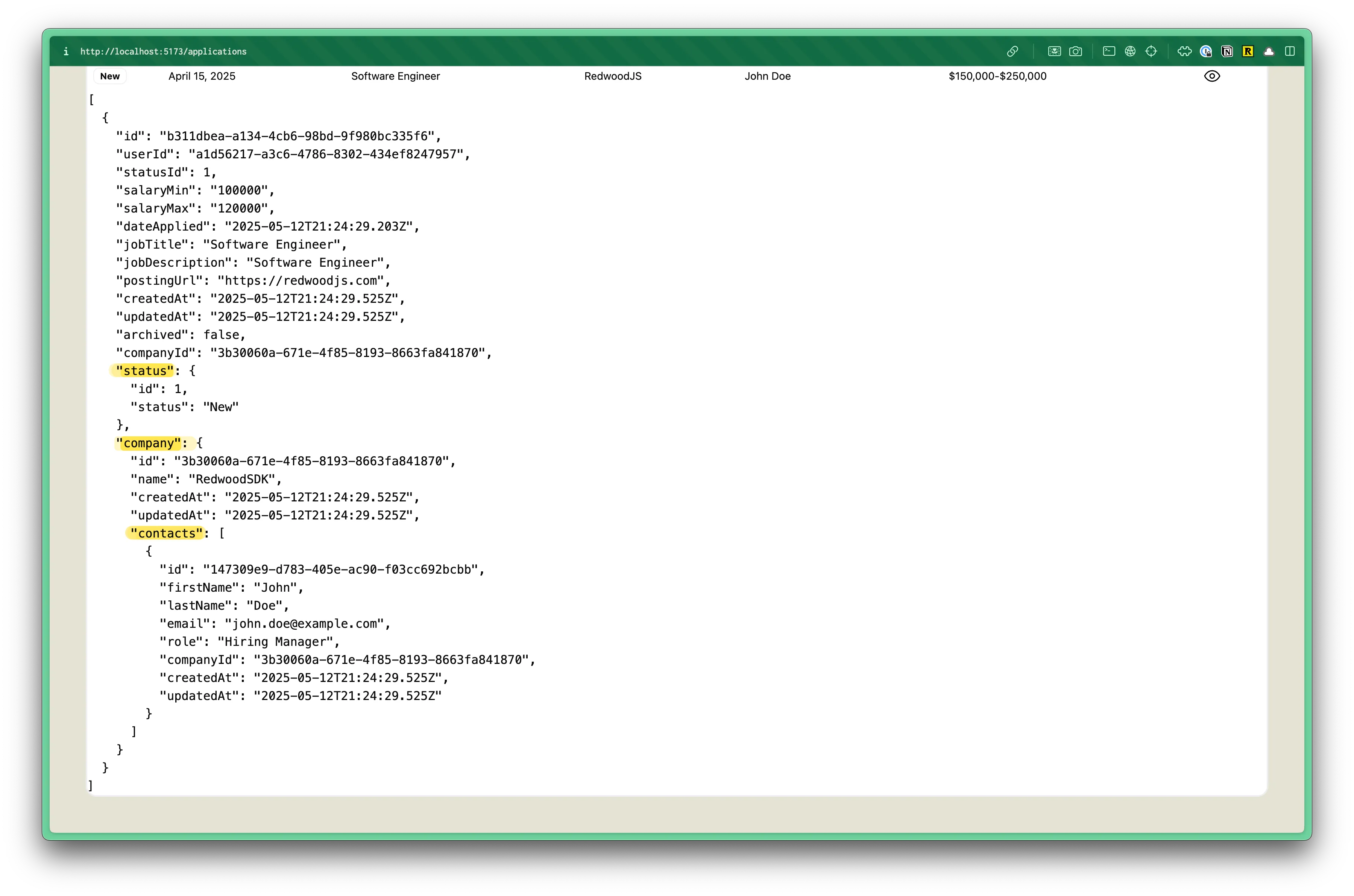 const createApplication = async () => { await db.application.create({ data: { ... company: { create: { name: "RedwoodSDK", contacts: { create: { firstName: "John", lastName: "Doe", email: "john.doe@example.com", role: "Hiring Manager", }, }, }, }, ...This time instead of using an object with a connect key, we’ll use a create key inside. Then, we can list an object with all the company’s data.