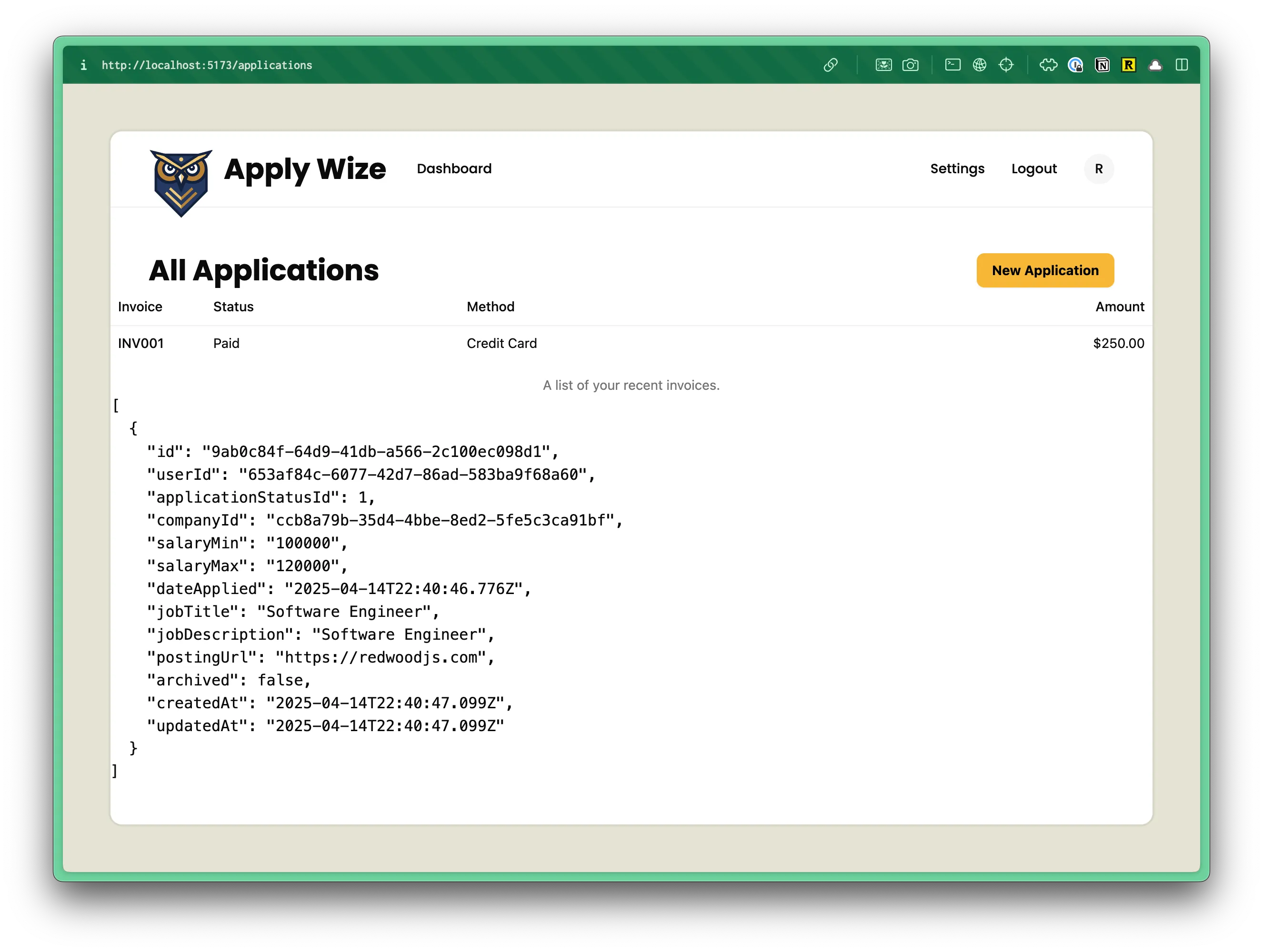 "/", "/user/login", "/user/signup", "/user/logout", "/legal/privacy", "/legal/terms", "/applications", "/applications/:id",]);Perfect. Everything should check out. Try clicking on the view icon in the browser. You should be redirected to a page with an “Application” heading.