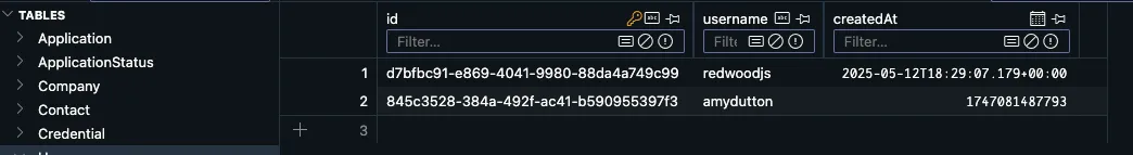 applicationtable. Then, using the Prismacreatefunction to add all the data in our database object. You'll notice that these values match the columns we defined inschema.prismafile.