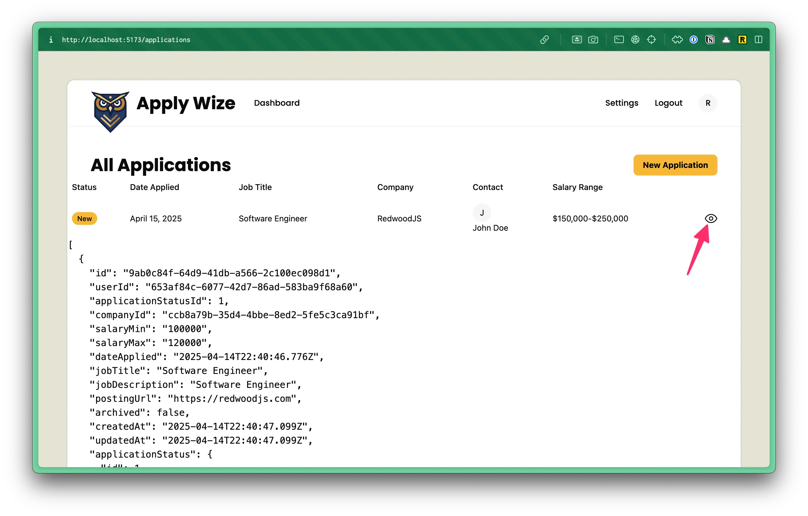 "/", "/user/login", "/user/signup", "/user/logout", "/legal/privacy", "/legal/terms", "/applications", "/applications/:id",]);Perfect. Everything should check out. Try clicking on the view icon in the browser. You should be redirected to a page with an “Application” heading.